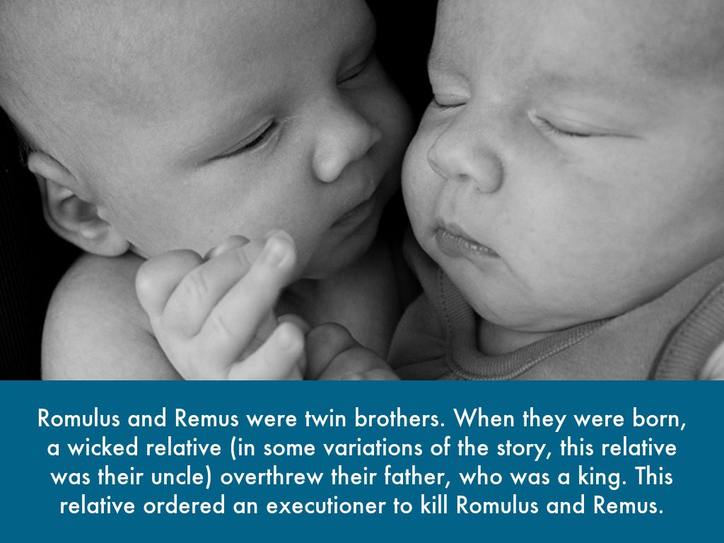 Romulus and Remus were twin brothers. When they were born, a wicked relative (in some variations of the story, this relative was their uncle) overthrew their father, who was a king. This relative ordered an executioner to kill Romulus and Remus.