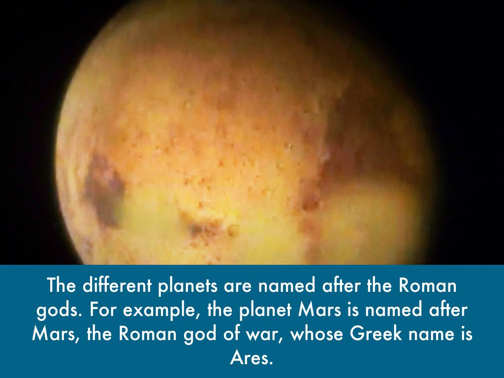 The different planets are named after the Roman gods. For example, the planet Mars is named after Mars, the Roman god of war, whose Greek name is Ares.
