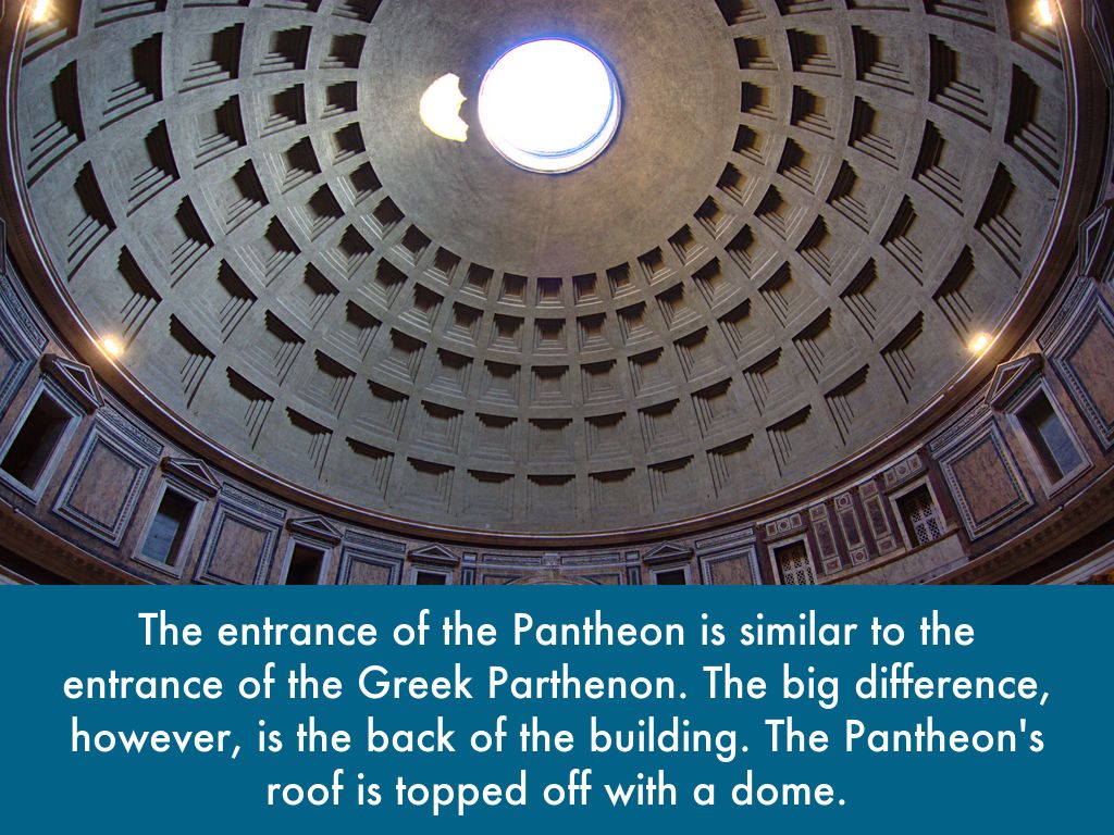 The entrance of the Pantheon is similar to the entrance of the Greek Parthenon. The big difference, however, is the back of the building. The Pantheon's roof is topped off with a dome.