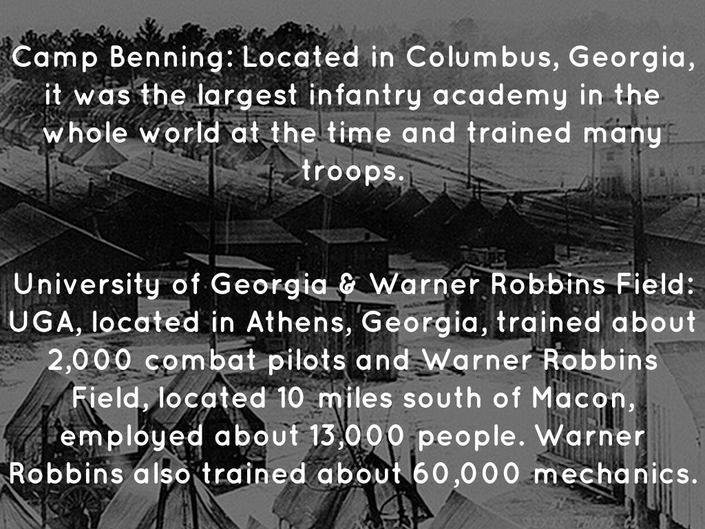 University of Georgia & Warner Robbins Field: UGA, located in Athens, Georgia, trained about 2,000 combat pilots and Warner Robbins Field, located 10 miles south of Macon, employed about 13,000 people. Warner Robbins also trained about 60,000 mechanics.