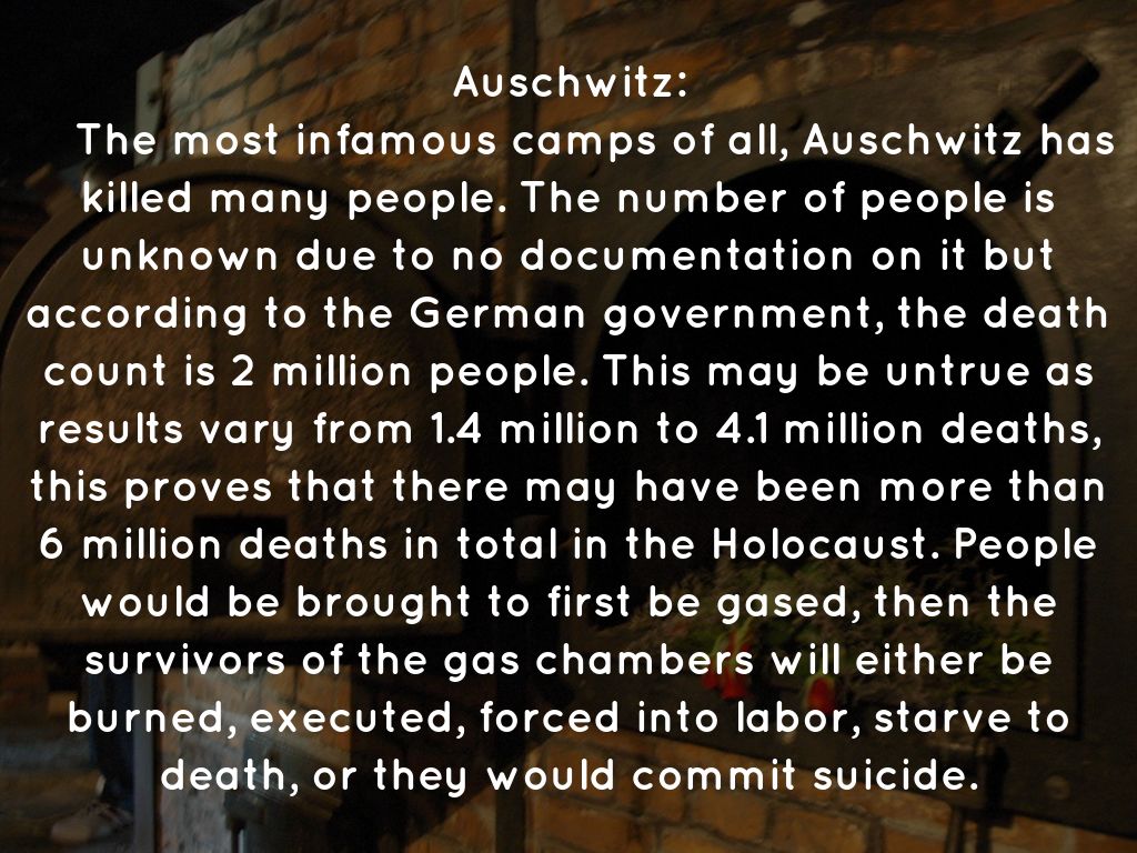The most infamous camps of all, Auschwitz has killed many people. The number of people is unknown due to no documentation on it but according to the German government, the death count is 2 million people. This may be untrue as results vary from 1.4 million to 4.1 million deaths, this proves that there may have been more than 6 million deaths in total in the Holocaust. People would be brought to first be gased, then the survivors of the gas chambers will either be burned, executed, forced into labor, starve to death, or they would commit suicide.