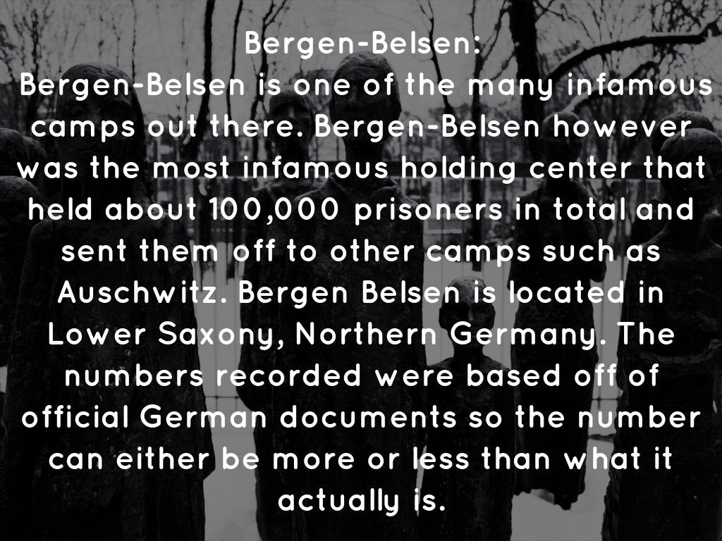 Bergen-Belsen is one of the many infamous camps out there. Bergen-Belsen however was the most infamous holding center that held about 100,000 prisoners in total and sent them off to other camps such as Auschwitz. Bergen Belsen is located in Lower Saxony, Northern Germany. The numbers recorded were based off of official German documents so the number can either be more or less than what it actually is.