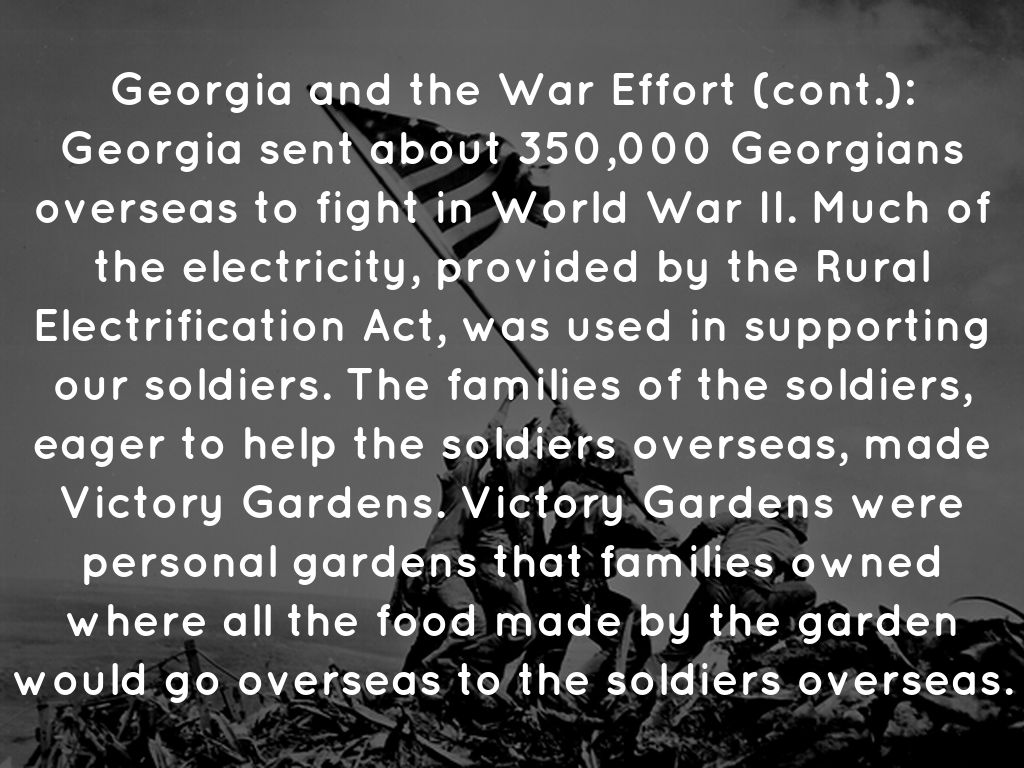 Georgia sent about 350,000 Georgians overseas to fight in World War II. Much of the electricity, provided by the Rural Electrification Act, was used in supporting our soldiers. The families of the soldiers, eager to help the soldiers overseas, made Victory Gardens. Victory Gardens were personal gardens that families owned where all the food made by the garden would go overseas to the soldiers overseas.