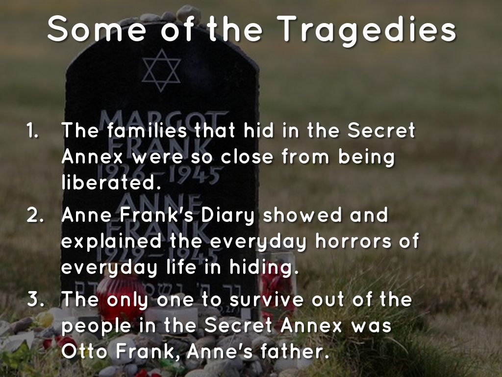 • The only one to survive out of the people in the Secret Annex was Otto Frank, Anne's father.
