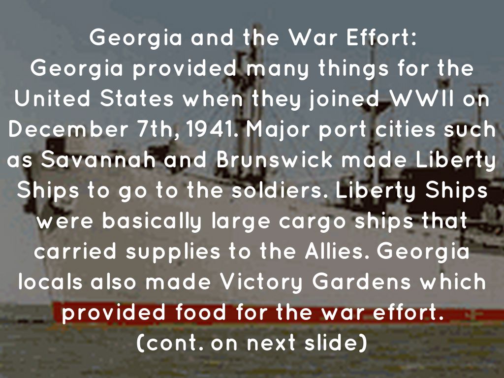 Georgia provided many things for the United States when they joined WWII on December 7th, 1941. Major port cities such as Savannah and Brunswick made Liberty Ships to go to the soldiers. Liberty Ships were basically large cargo ships that carried supplies to the Allies. Georgia locals also made Victory Gardens which provided food for the war effort.