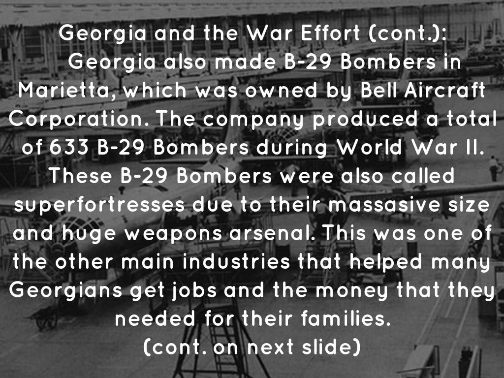 Georgia also made B-29 Bombers in Marietta, which was owned by Bell Aircraft Corporation. The company produced a total of 633 B-29 Bombers during World War II. These B-29 Bombers were also called superfortresses due to their massasive size and huge weapons arsenal. This was one of the other main industries that helped many Georgians get jobs and the money that they needed for their families.