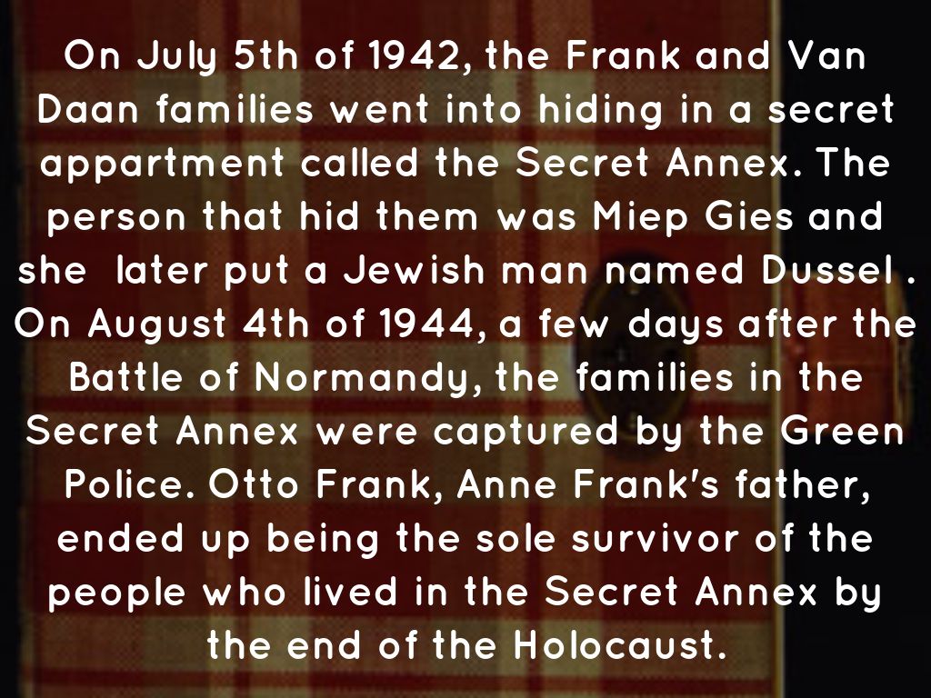 On July 5th of 1942, the Frank and Van Daan families went into hiding in a secret appartment called the Secret Annex. The person that hid them was Miep Gies and she later put a Jewish man named Dussel . On August 4th of 1944, a few days after the Battle of Normandy, the families in the Secret Annex were captured by the Green Police. Otto Frank, Anne Frank's father, ended up being the sole survivor of the people who lived in the Secret Annex by the end of the Holocaust.