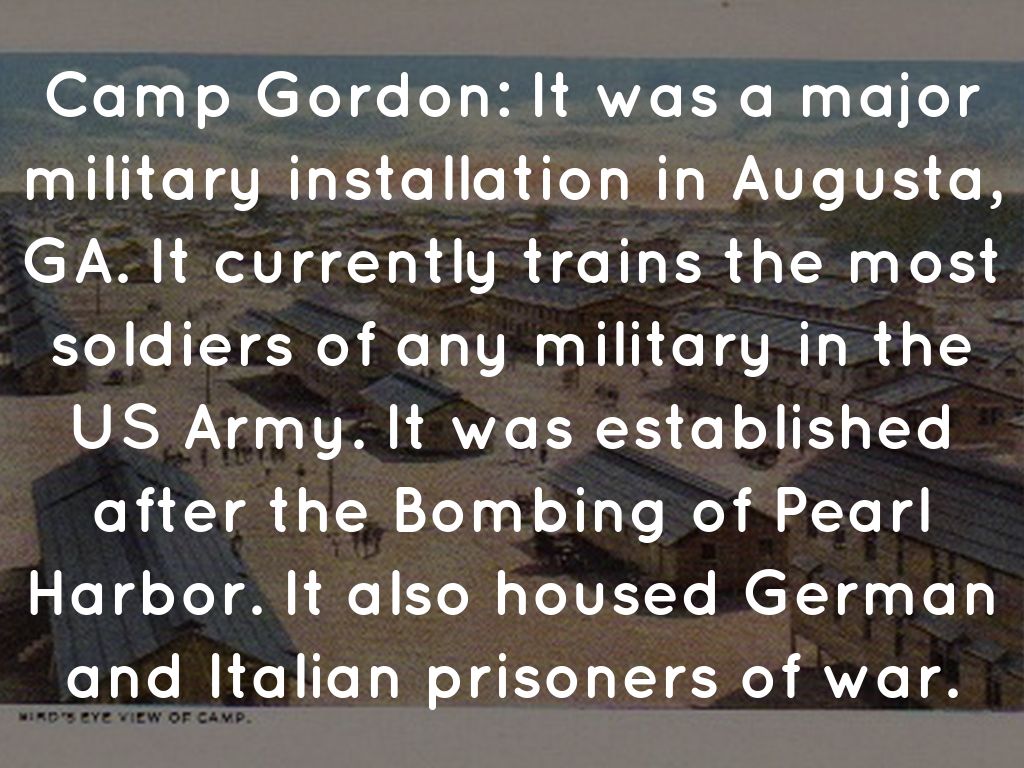 Camp Gordon: It was a major military installation in Augusta, GA. It currently trains the most soldiers of any military in the US Army. It was established after the Bombing of Pearl Harbor. It also housed German and Italian prisoners of war.