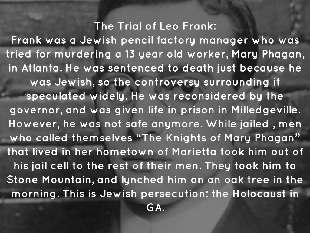 Frank was a Jewish pencil factory manager who was tried for murdering a 13 year old worker, Mary Phagan, in Atlanta. He was sentenced to death just because he was Jewish, so the controversy surrounding it speculated widely. He was reconsidered by the governor, and was given life in prison in Milledgeville. However, he was not safe anymore. While jailed , men who called themselves “The Knights of Mary Phagan” that lived in her hometown of Marietta took him out of his jail cell to the rest of their men. They took him to Stone Mountain, and lynched him on an oak tree in the morning. This is Jewish persecution: the Holocaust in GA.