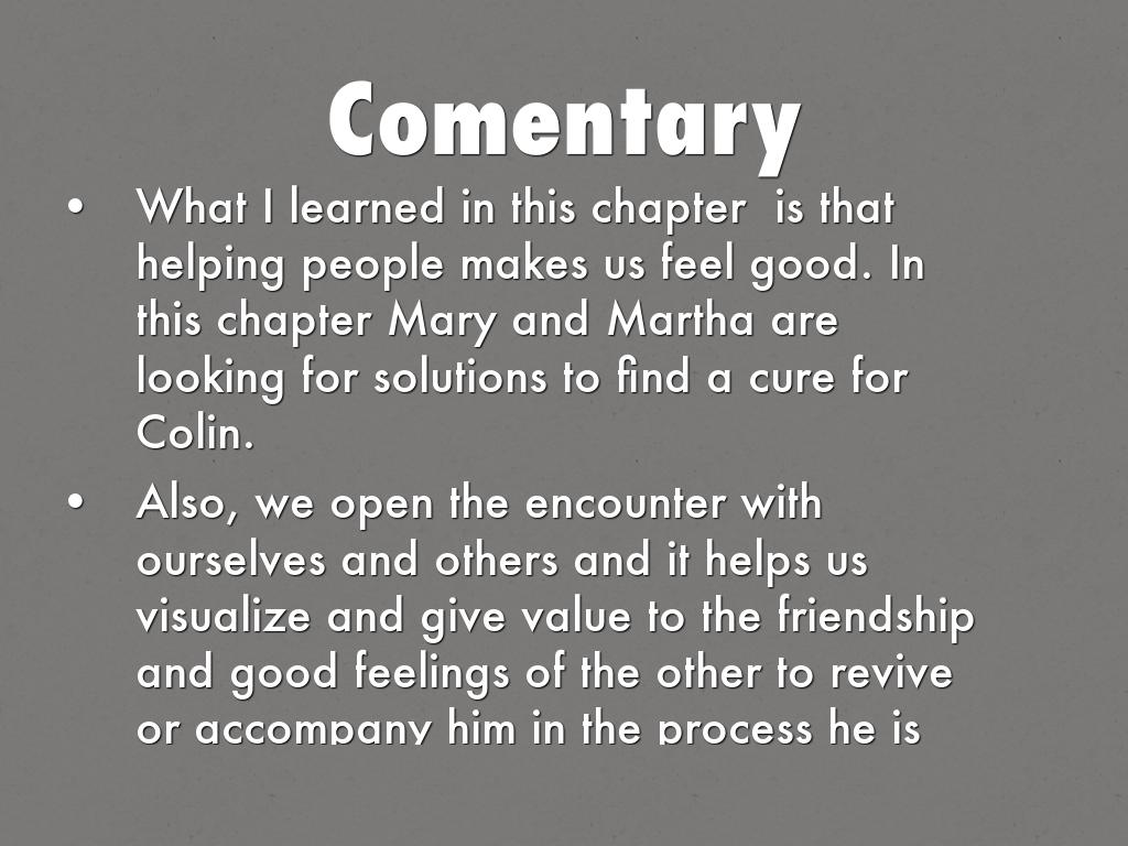 - What I learned in this chapter is that helping people makes us feel good. In this chapter Mary and Martha are looking for solutions to find a cure for Colin.