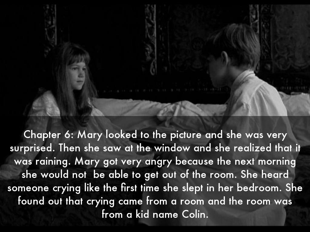 Chapter 6: Mary looked to the picture and she was very surprised. Then she saw at the window and she realized that it was raining. Mary got very angry because the next morning she would not be able to get out of the room. She heard someone crying like the first time she slept in her bedroom. She found out that crying came from a room and the room was from a kid name Colin.