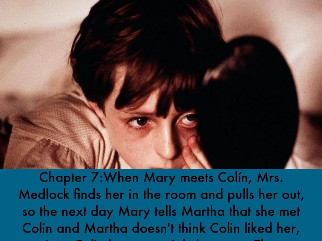 Chapter 7:When Mary meets Colín, Mrs. Medlock finds her in the room and pulls her out, so the next day Mary tells Martha that she met Colin and Martha doesn't think Colin liked her, since Colin has a special character. Then together they began to think about how to get Colin out of his room to show him the secret garden.