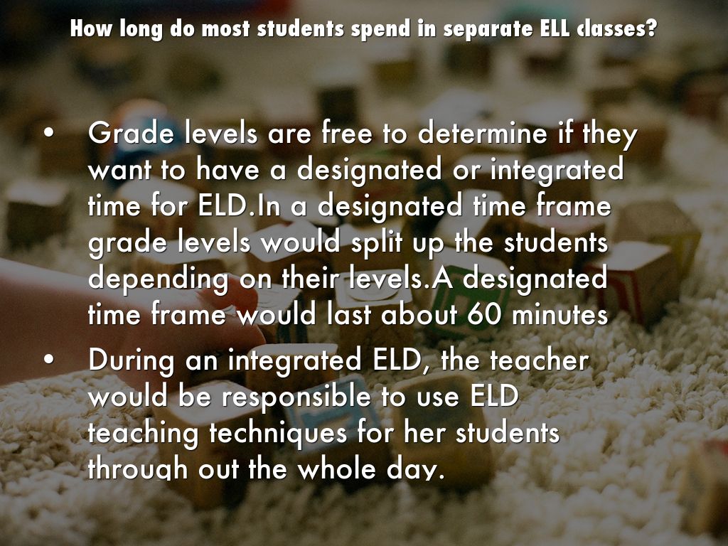 Grade levels are free to determine if they want to have a designated or integrated time for ELD.In a designated time frame grade levels would split up the students depending on their levels.A designated time frame would last about 60 minutes