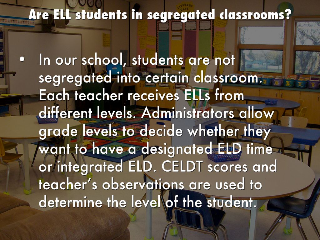 In our school, students are not segregated into certain classroom. Each teacher receives ELLs from different levels. Administrators allow grade levels to decide whether they want to have a designated ELD time or integrated ELD. CELDT scores and teacher’s observations are used to determine the level of the student.