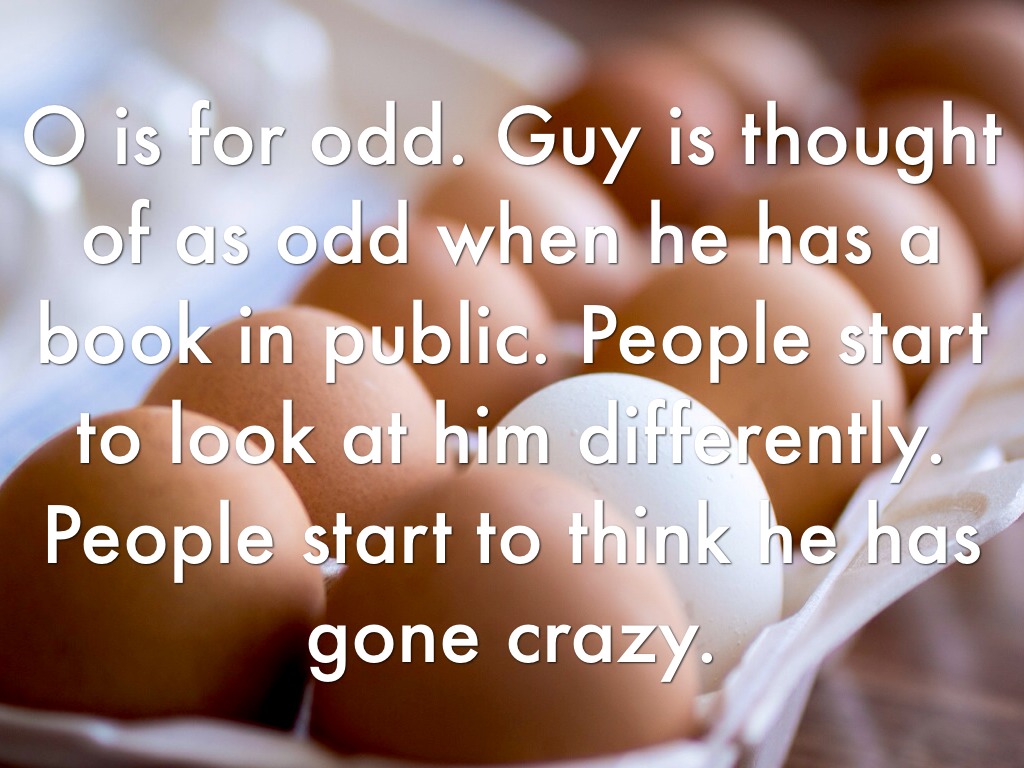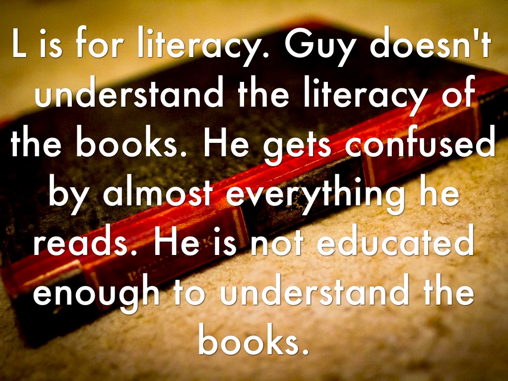 L is for literacy. Guy doesn't understand the literacy of the books. He gets confused by almost everything he reads. He is not educated enough to understand the books.