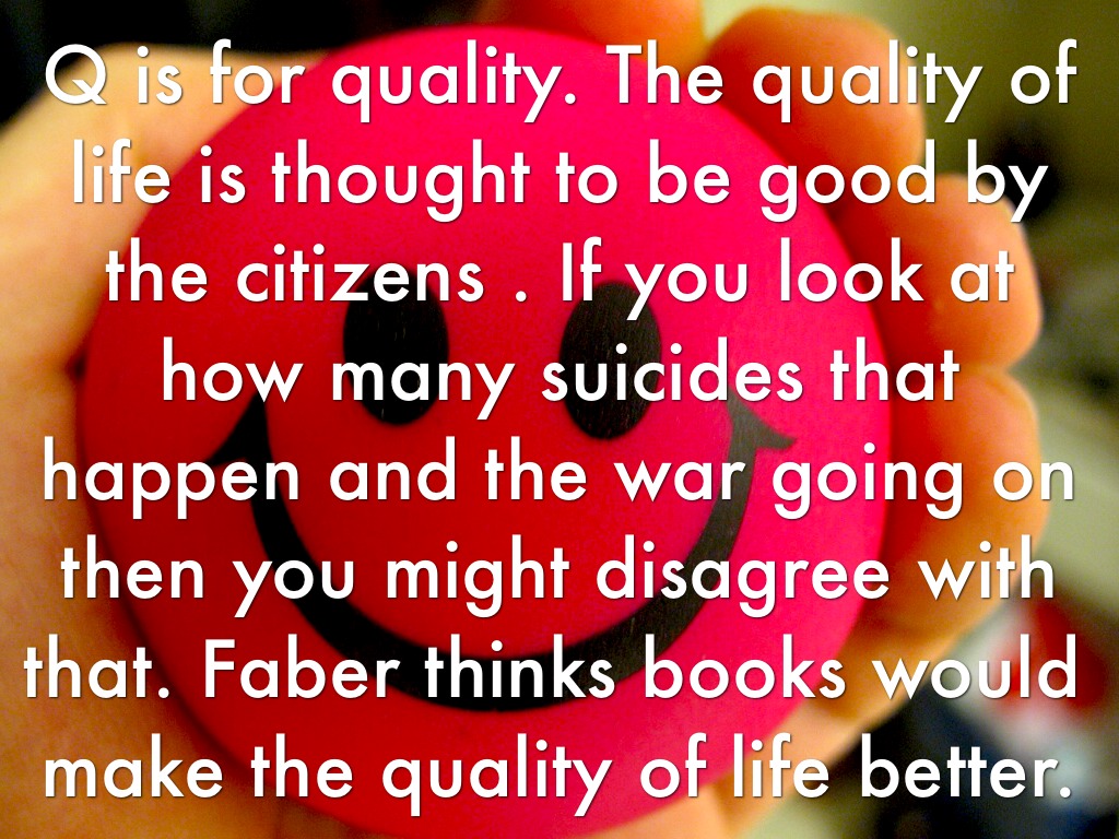 Q is for quality. The quality of life is thought to be good by the citizens . If you look at how many suicides that happen and the war going on then you might disagree with that. Faber thinks books would make the quality of life better.