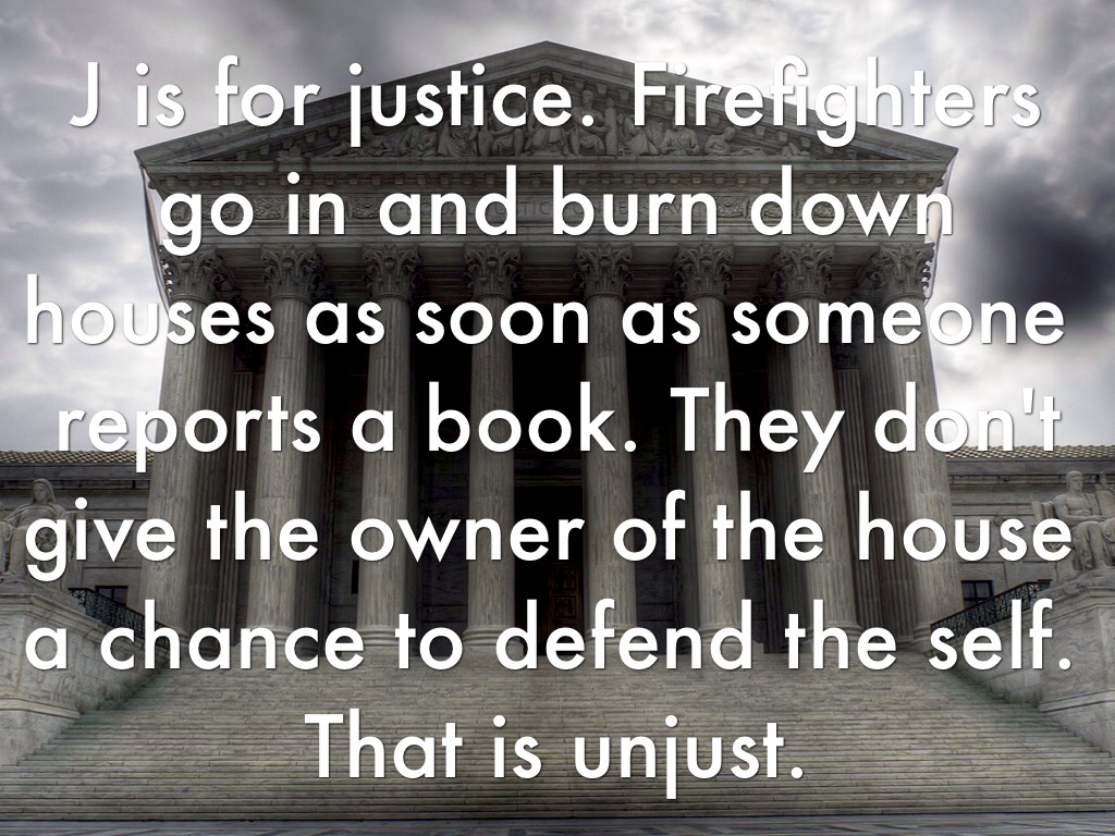 J is for justice. Firefighters go in and burn down houses as soon as someone reports a book. They don't give the owner of the house a chance to defend the self. That is unjust.