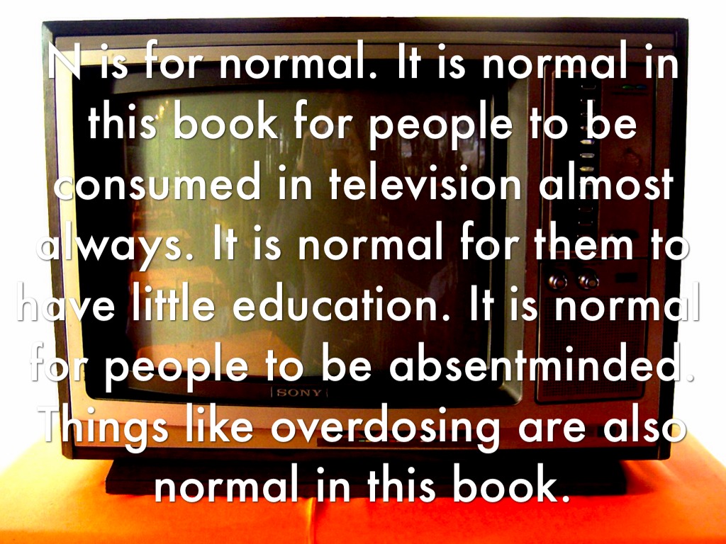 N is for normal. It is normal in this book for people to be consumed in television almost always. It is normal for them to have little education. It is normal for people to be absentminded. Things like overdosing are also normal in this book.