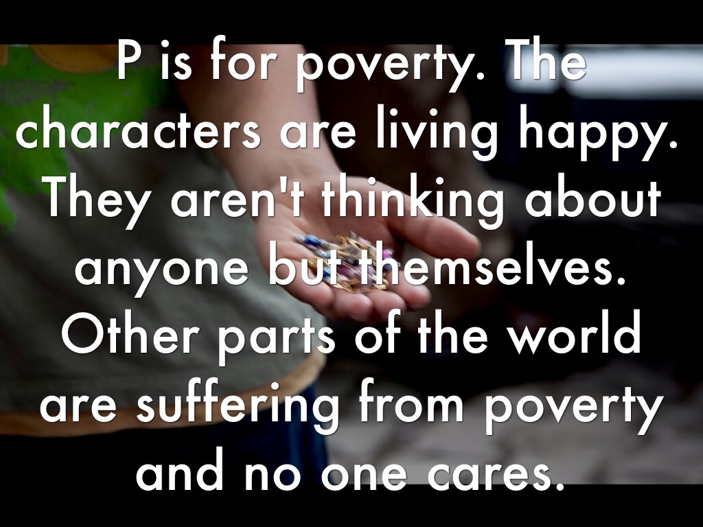 P is for poverty. The characters are living happy. They aren't thinking about anyone but themselves. Other parts of the world are suffering from poverty and no one cares.