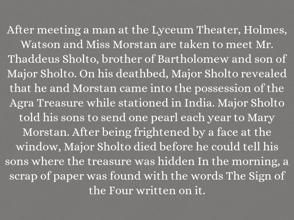 After meeting a man at the Lyceum Theater, Holmes, Watson and Miss Morstan are taken to meet Mr. Thaddeus Sholto, brother of Bartholomew and son of Major Sholto. On his deathbed, Major Sholto revealed that he and Morstan came into the possession of the Agra Treasure while stationed in India. Major Sholto told his sons to send one pearl each year to Mary Morstan. After being frightened by a face at the window, Major Sholto died before he could tell his sons where the treasure was hidden In the morning, a scrap of paper was found with the words The Sign of the Four written on it.