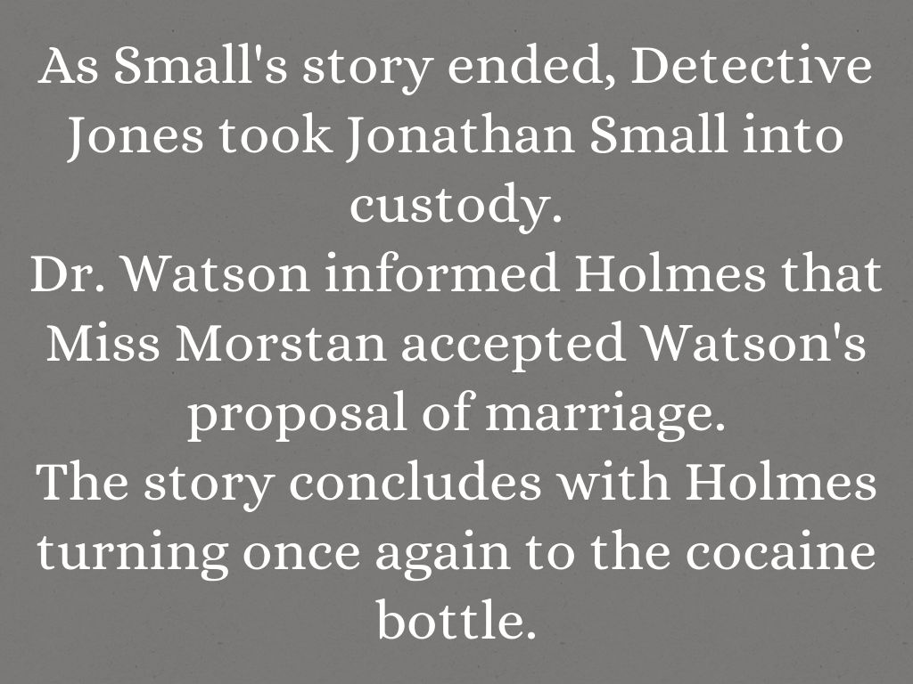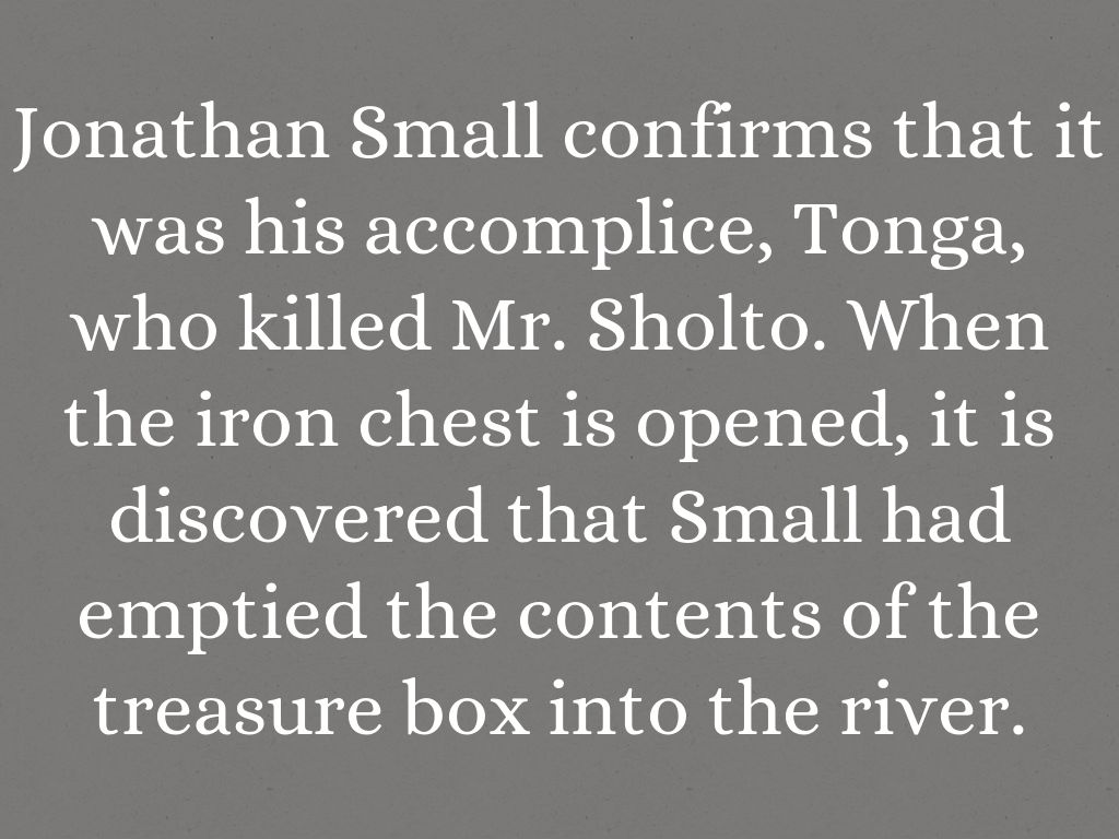 Jonathan Small confirms that it was his accomplice, Tonga, who killed Mr. Sholto. When the iron chest is opened, it is discovered that Small had emptied the contents of the treasure box into the river.