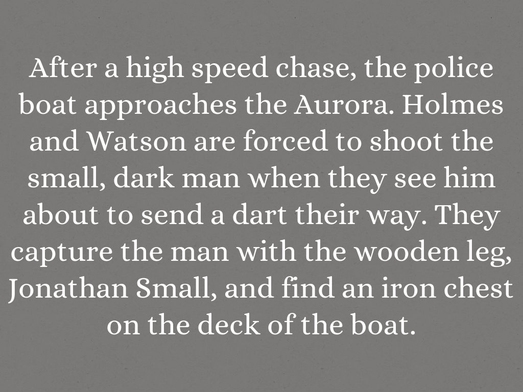 After a high speed chase, the police boat approaches the Aurora. Holmes and Watson are forced to shoot the small, dark man when they see him about to send a dart their way. They capture the man with the wooden leg, Jonathan Small, and find an iron chest on the deck of the boat.