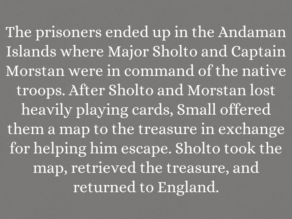 The prisoners ended up in the Andaman Islands where Major Sholto and Captain Morstan were in command of the native troops. After Sholto and Morstan lost heavily playing cards, Small offered them a map to the treasure in exchange for helping him escape. Sholto took the map, retrieved the treasure, and returned to England.