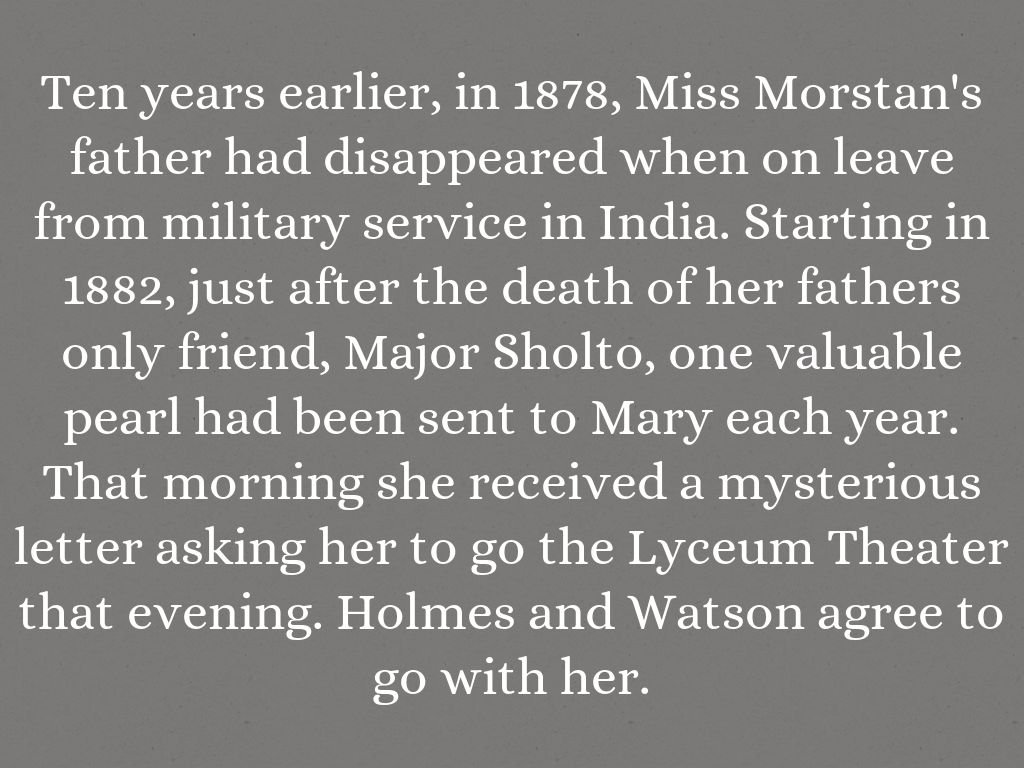 Ten years earlier, in 1878, Miss Morstan's father had disappeared when on leave from military service in India. Starting in 1882, just after the death of her fathers only friend, Major Sholto, one valuable pearl had been sent to Mary each year. That morning she received a mysterious letter asking her to go the Lyceum Theater that evening. Holmes and Watson agree to go with her.