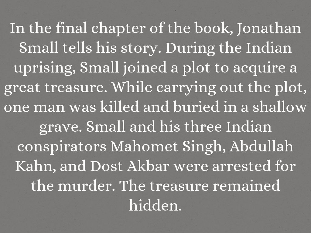 In the final chapter of the book, Jonathan Small tells his story. During the Indian uprising, Small joined a plot to acquire a great treasure. While carrying out the plot, one man was killed and buried in a shallow grave. Small and his three Indian conspirators Mahomet Singh, Abdullah Kahn, and Dost Akbar were arrested for the murder. The treasure remained hidden.