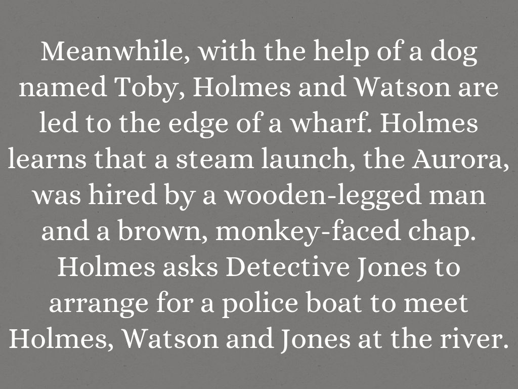 Meanwhile, with the help of a dog named Toby, Holmes and Watson are led to the edge of a wharf. Holmes learns that a steam launch, the Aurora, was hired by a wooden-legged man and a brown, monkey-faced chap. Holmes asks Detective Jones to arrange for a police boat to meet Holmes, Watson and Jones at the river.