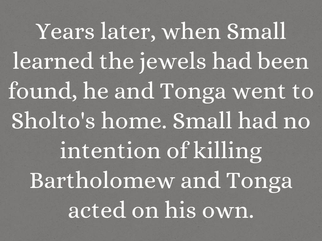 Years later, when Small learned the jewels had been found, he and Tonga went to Sholto's home. Small had no intention of killing Bartholomew and Tonga acted on his own.