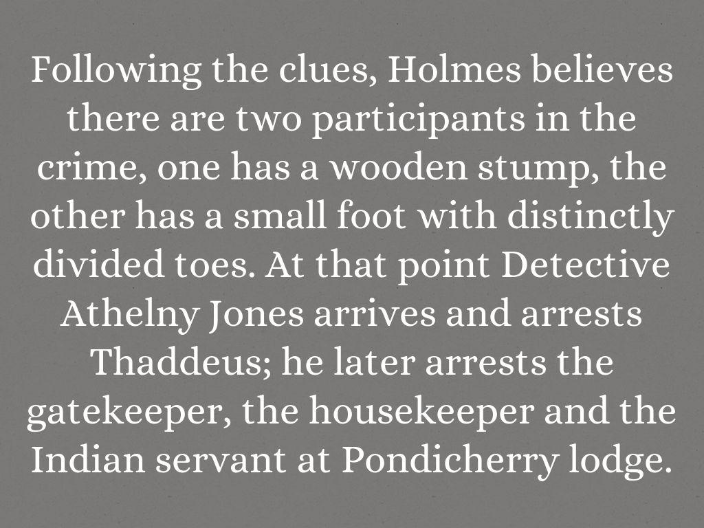Following the clues, Holmes believes there are two participants in the crime, one has a wooden stump, the other has a small foot with distinctly divided toes. At that point Detective Athelny Jones arrives and arrests Thaddeus; he later arrests the gatekeeper, the housekeeper and the Indian servant at Pondicherry lodge.