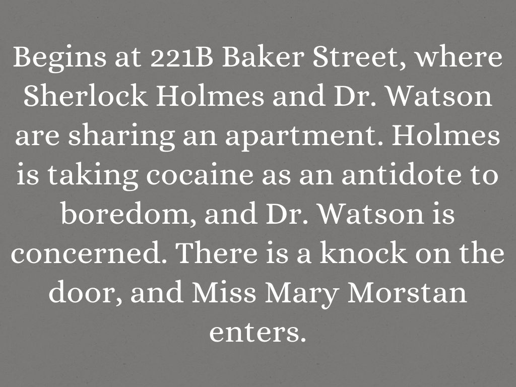 Begins at 221B Baker Street, where Sherlock Holmes and Dr. Watson are sharing an apartment. Holmes is taking cocaine as an antidote to boredom, and Dr. Watson is concerned. There is a knock on the door, and Miss Mary Morstan enters.