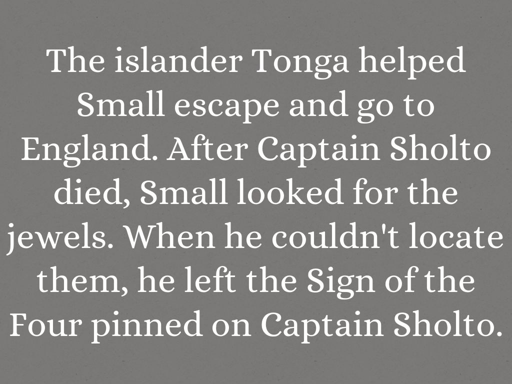 The islander Tonga helped Small escape and go to England. After Captain Sholto died, Small looked for the jewels. When he couldn't locate them, he left the Sign of the Four pinned on Captain Sholto.
