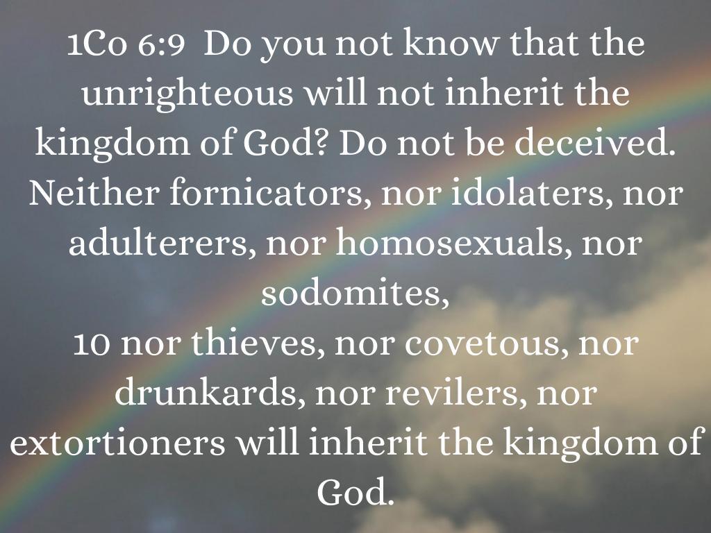1Co 6:9 Do you not know that the unrighteous will not inherit the kingdom of God? Do not be deceived. Neither fornicators, nor idolaters, nor adulterers, nor homosexuals, nor sodomites, 10 nor thieves, nor covetous, nor drunkards, nor revilers, nor extortioners will inherit the kingdom of God.