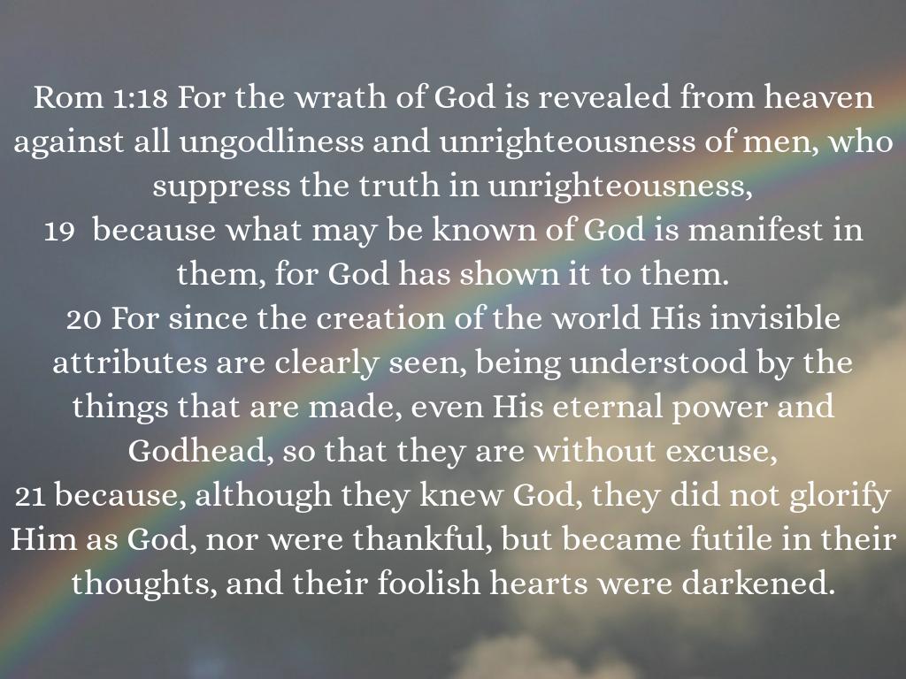 Rom 1:18 For the wrath of God is revealed from heaven against all ungodliness and unrighteousness of men, who suppress the truth in unrighteousness, 19 because what may be known of God is manifest in them, for God has shown it to them. 20 For since the creation of the world His invisible attributes are clearly seen, being understood by the things that are made, even His eternal power and Godhead, so that they are without excuse, 21 because, although they knew God, they did not glorify Him as God, nor were thankful, but became futile in their thoughts, and their foolish hearts were darkened.