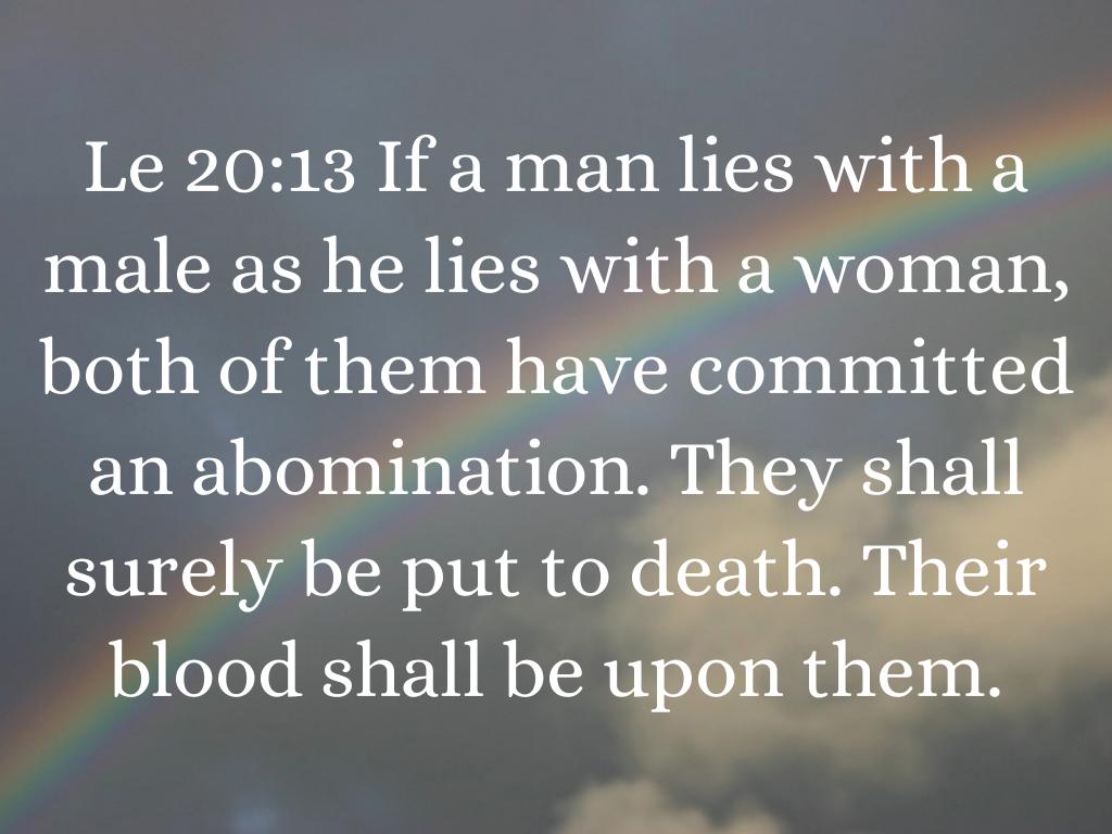 Le 20:13 If a man lies with a male as he lies with a woman, both of them have committed an abomination. They shall surely be put to death. Their blood shall be upon them.