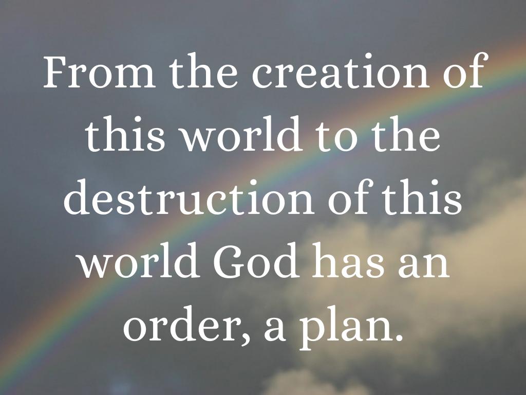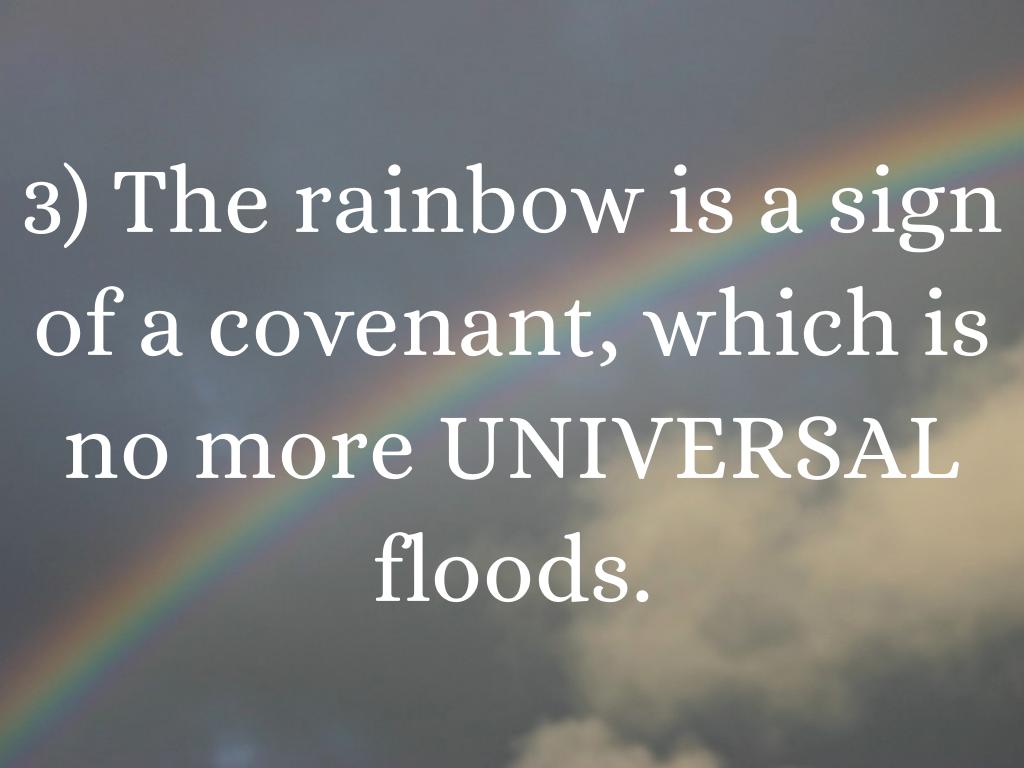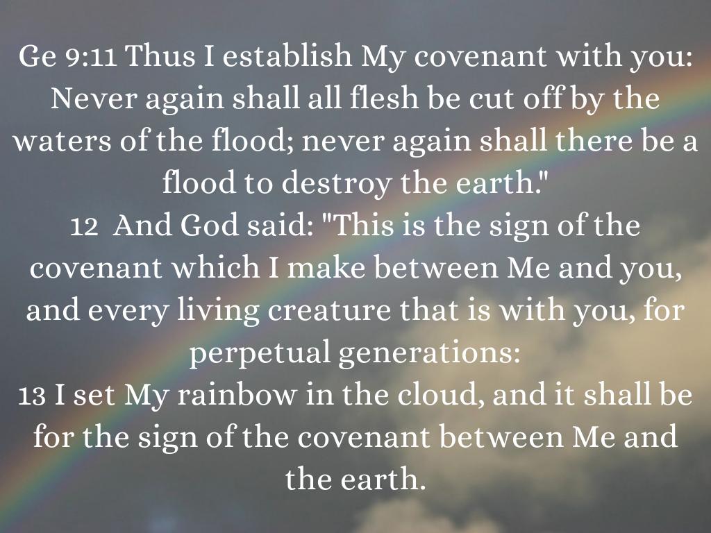 Ge 9:11 Thus I establish My covenant with you: Never again shall all flesh be cut off by the waters of the flood; never again shall there be a flood to destroy the earth." 12 And God said: "This is the sign of the covenant which I make between Me and you, and every living creature that is with you, for perpetual generations: 13 "I set My rainbow in the cloud, and it shall be for the sign of the covenant between Me and the earth.