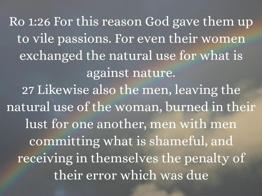 Ro 1:26 For this reason God gave them up to vile passions. For even their women exchanged the natural use for what is against nature. 27 Likewise also the men, leaving the natural use of the woman, burned in their lust for one another, men with men committing what is shameful, and receiving in themselves the penalty of their error which was due