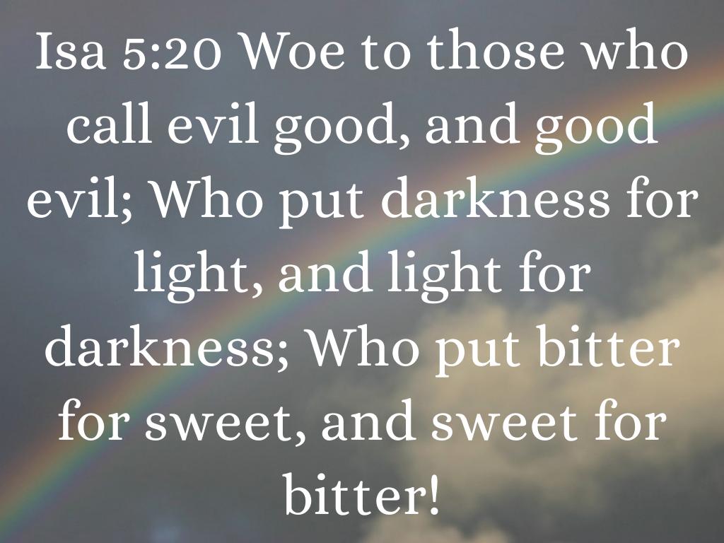Isa 5:20 Woe to those who call evil good, and good evil; Who put darkness for light, and light for darkness; Who put bitter for sweet, and sweet for bitter!