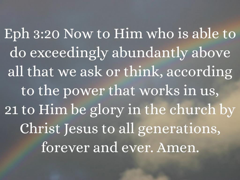 Eph 3:20 Now to Him who is able to do exceedingly abundantly above all that we ask or think, according to the power that works in us, 21 to Him be glory in the church by Christ Jesus to all generations, forever and ever. Amen.