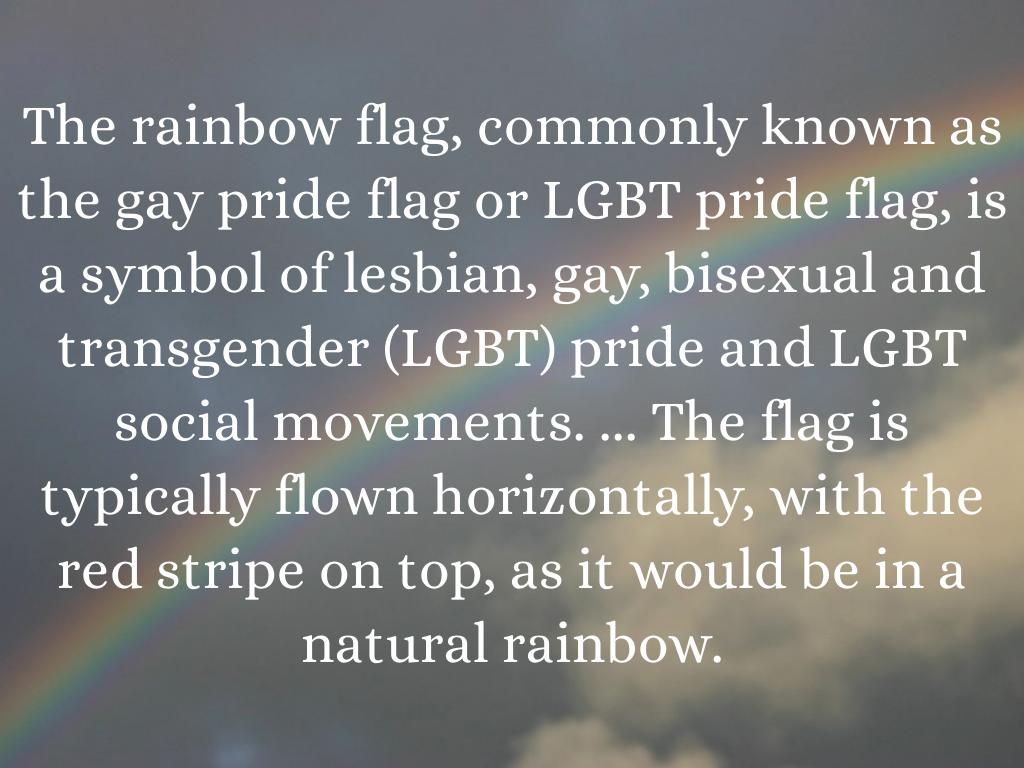 The rainbow flag, commonly known as the gay pride flag or LGBT pride flag, is a symbol of lesbian, gay, bisexual and transgender (LGBT) pride and LGBT social movements. ... The flag is typically flown horizontally, with the red stripe on top, as it would be in a natural rainbow.