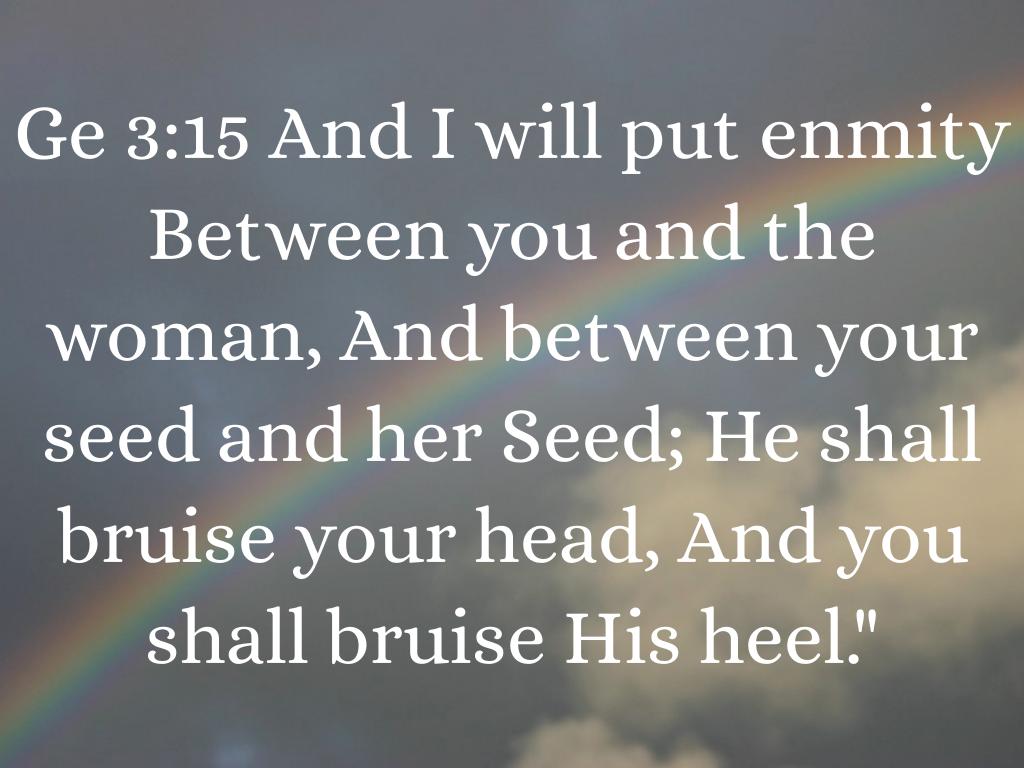 Ge 3:15 And I will put enmity Between you and the woman, And between your seed and her Seed; He shall bruise your head, And you shall bruise His heel."