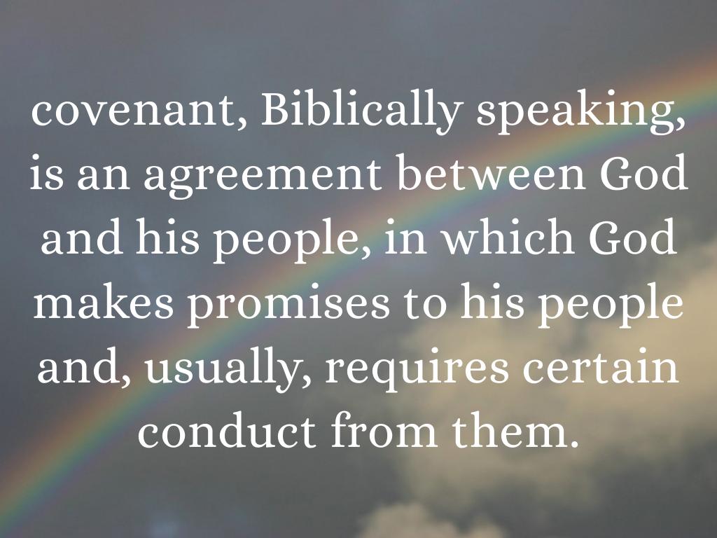 covenant, Biblically speaking, is an agreement between God and his people, in which God makes promises to his people and, usually, requires certain conduct from them.