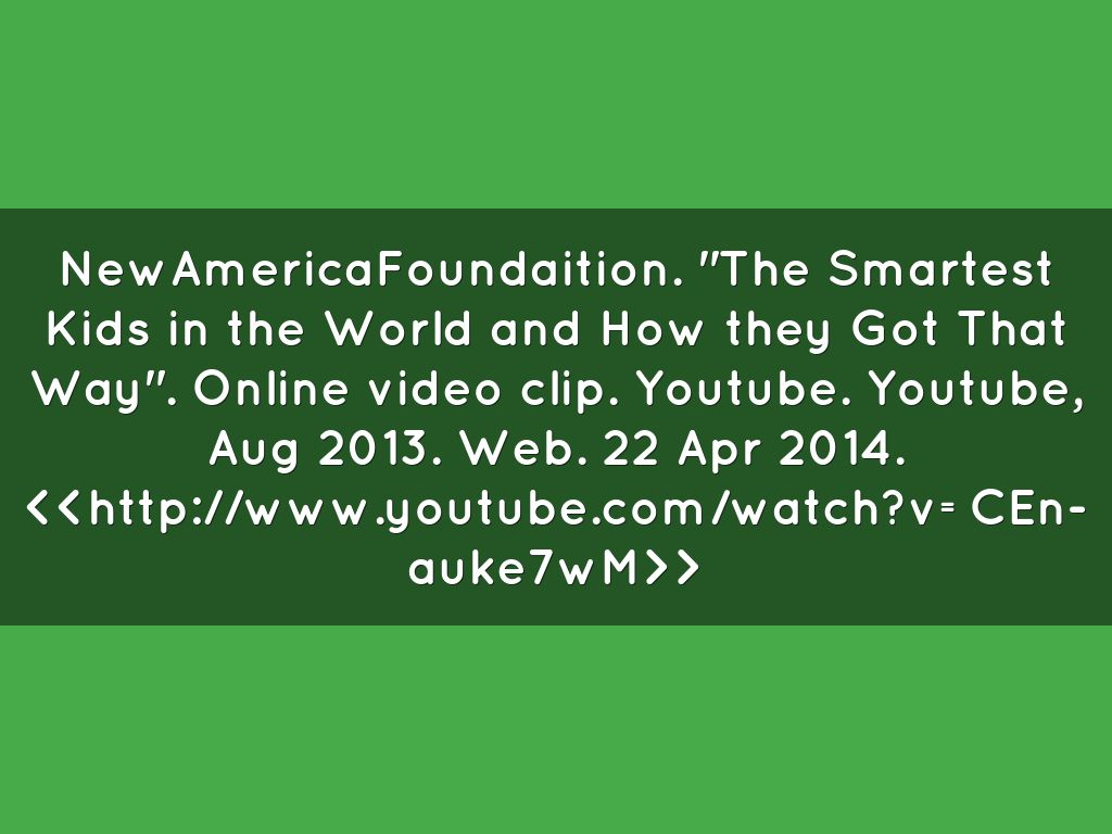 NewAmericaFoundaition. "The Smartest Kids in the World and How they Got That Way". Online video clip. Youtube. Youtube, Aug 2013. Web. 22 Apr 2014. >