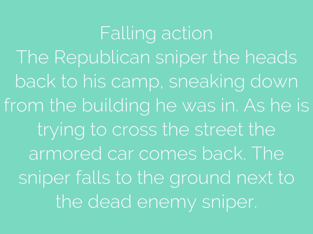 The rising action begins when the sniper eats his sandwich and lights a cigarette. He looks over the edge of the building and sees an armored car, he then shoots an informer and a machine gun guy. Afterwards the Republican sniper is found by an enemy sniper, and gets shot in the arm. The sniper then creates a plan to kill the enemy sniper.