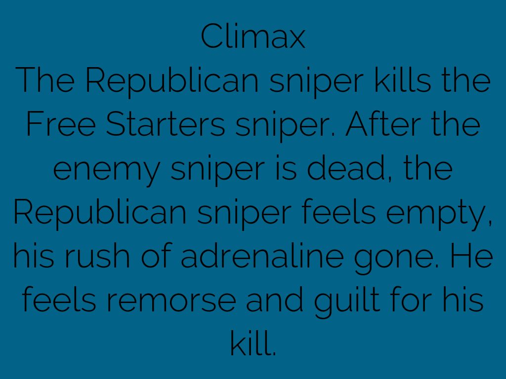 The Republican sniper kills the Free Starters sniper. After the enemy sniper is dead, the Republican sniper feels empty, his rush of adrenaline gone. He feels remorse and guilt for his kill.