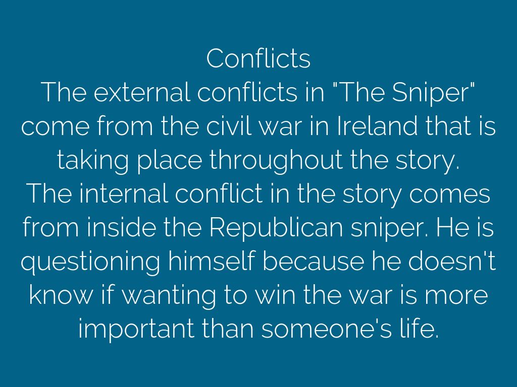The internal conflict in the story comes from inside the Republican sniper. He is questioning himself because he doesn't know if wanting to win the war is more important than someone's life.