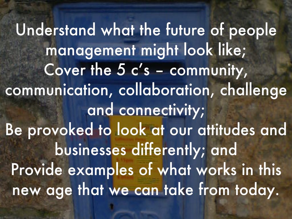 Understand what the future of people management might look like; Cover the 5 c’s – community, communication, collaboration, challenge and connectivity; Be provoked to look at our attitudes and businesses differently; and Provide examples of what works in this new age that we can take from today.
