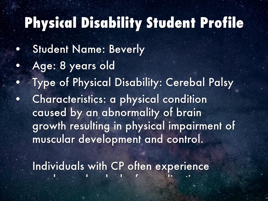 Characteristics: a physical condition caused by an abnormality of brain growth resulting in physical impairment of muscular development and control.